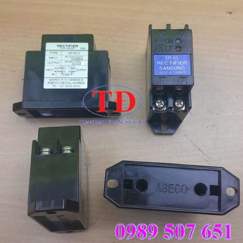 Đi ốt chỉnh lưu cầu trục SR-60-2 còn gọi là diode thắng cầu trục dùng cho động cơ nâng hạ palang để đóng mở phanh của động cơ nâng hạ, di chuyển. Đi ốt chỉnh lưu cầu trục SR-60-2 là dùng để chỉnh lưu dòng điện xoay chiều 1P/220V/50Hz sang dòng điện 1 chiều DC 99V cho cuộn hút phanh để đóng mở phanh động cơ nâng hạ.